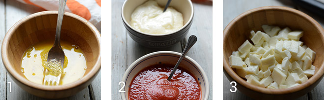 In ciotole distinte versare la di passata di pomodoro e la besciamella (foto 2). Tagliare la mozzarella in piccoli cubetti (foto 3).
