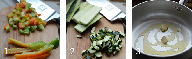 Lava e taglia a julienne i peperoni (foto 1) e le zucchine private della parte bianca (foto 2).