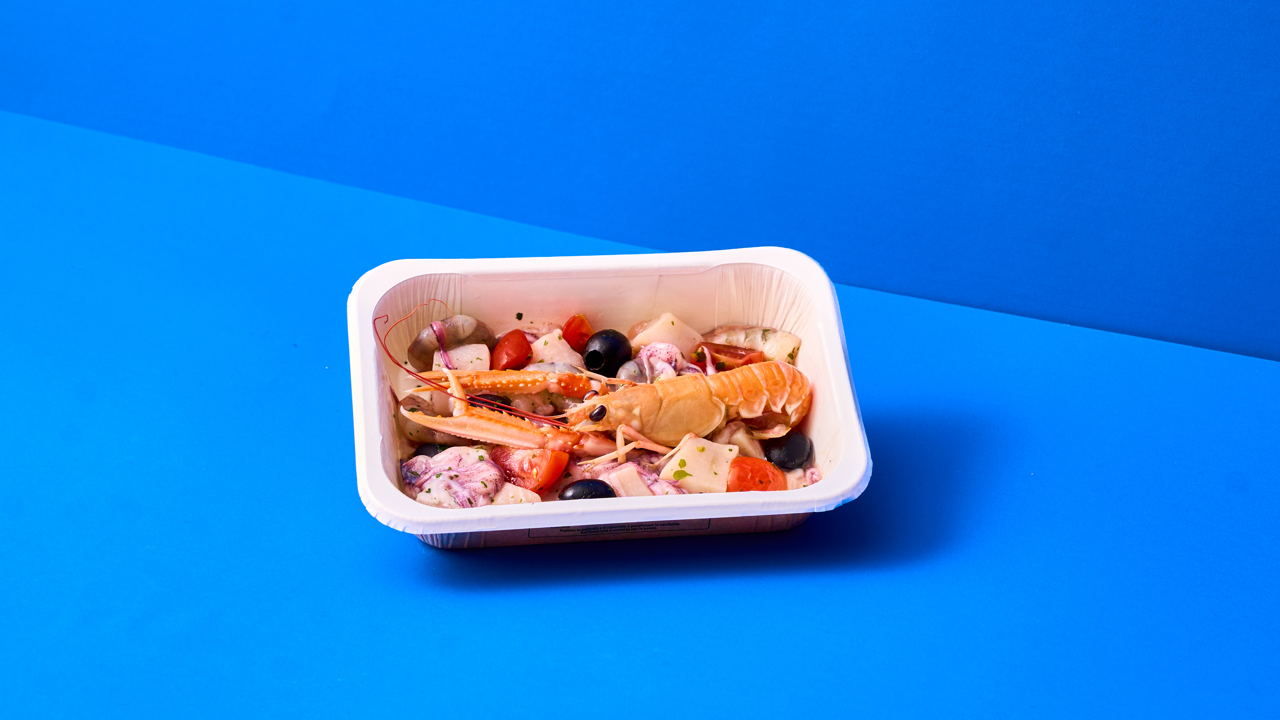 Preparato per sugo allo scoglio con mattonella di polenta alla griglia