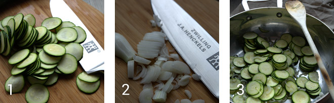 Lava e taglia le zucchine a rondelle (foto 1) e monda e trita i cipollotti (foto 2).